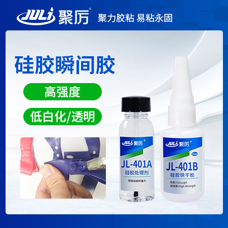 聚厲牌JL-401AB型 硅膠瞬間膠適用于硅膠和硅膠,硅膠與金屬,硅膠跟塑膠,硅膠與陶瓷木材等材料的粘合。這款無需處理即可粘接;廣泛應用于電子電器,玩具禮品,醫療器材,汽車配件等。